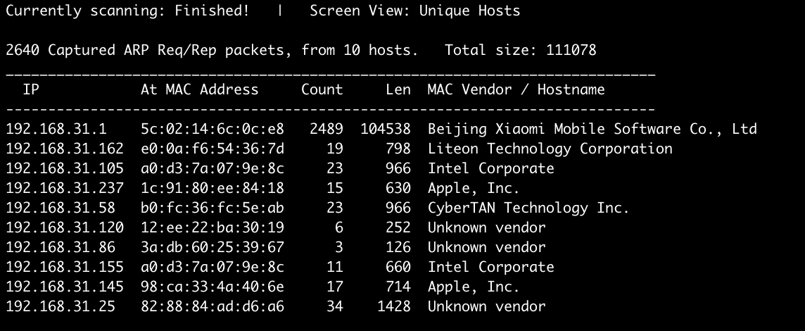 sudo netdiscover -i eth0 -r 192.168.31.0/24