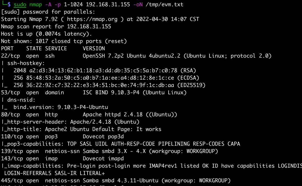 sudo nmap -A - p 1-1024 192.168.31. 155 - oN /tmp/evm.txt
