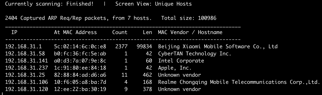 sudo netdiscover -i eth0 -r 192.168.31.0/24