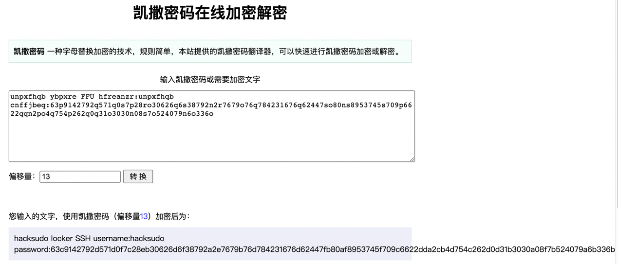 在线进行凯撒解密,偏移为 13 :http://moersima.00cha.net/kaisamima.asp