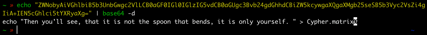 | 1 | echo "ZWNobyAiVGhlbiB5b3UnbGwgc2VlLCB0aGF0IGl0IGlzIG5vdCB0aGUgc3Bvb24gdGhhdCBiZW5kcywgaXQgaXMgb25seSB5b3Vyc2VsZi4gIiA+IEN5cGhlci5tYXRyaXg=" | base64 -d |