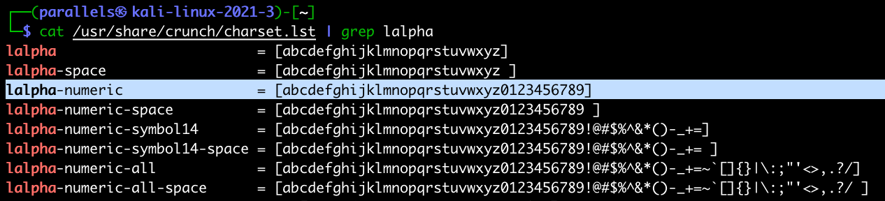 | 1 | crunch 8 8 -f /usr/share/crunch/charset.lst lalpha-numeric -t k1ll0r@@ > pass.dic |