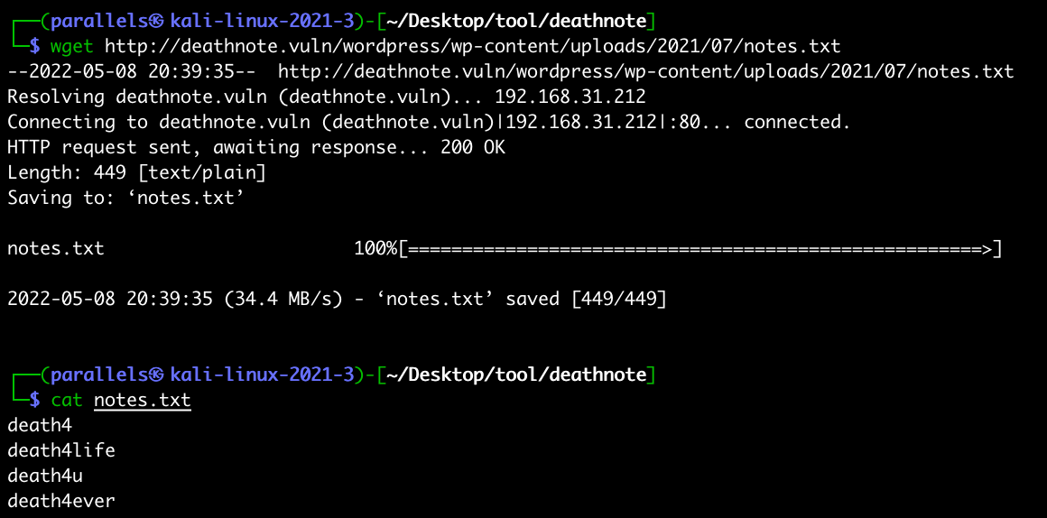 | 1 | wget http://deathnote.vuln/wordpress/wp-content/uploads/2021/07/notes.txt |