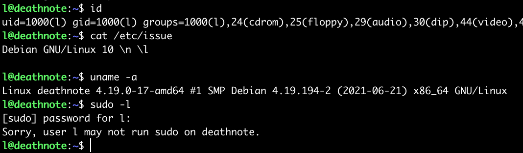 -> 用户 l 在目标机器上没有 sudo 权限
