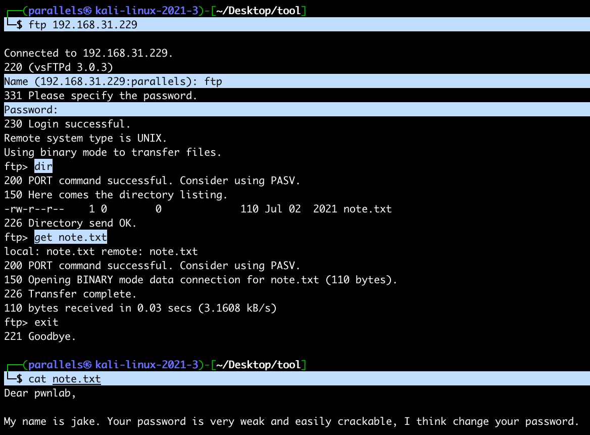 | 1 | 利用用户ftp和空密码登陆到ftp查看有没有敏感文件 |