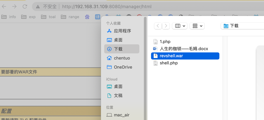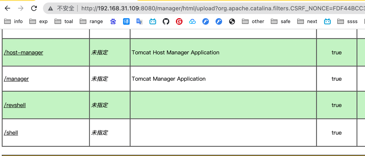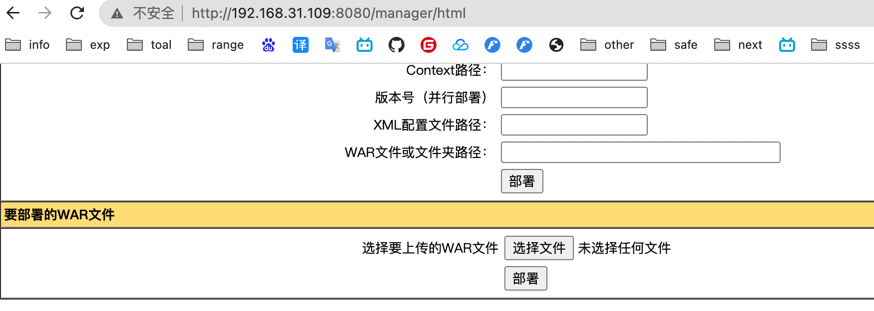 http://192.168.31.109:8080/manager/html 存在一个文件上传的漏洞,可用来上传 war 后门文件