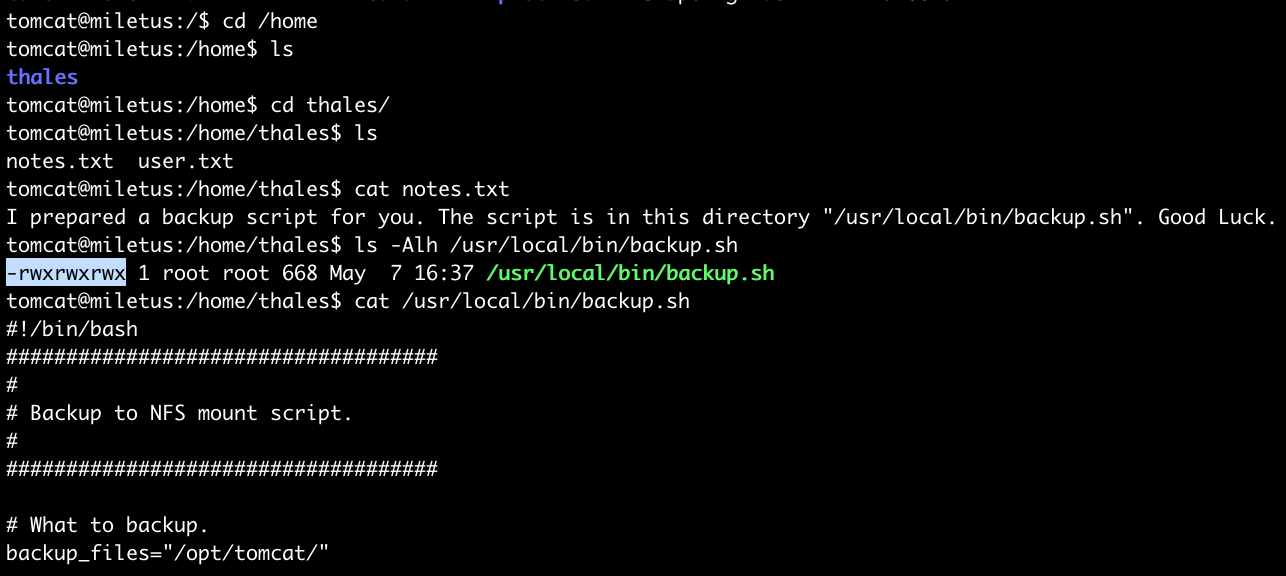 根据 notes.txt 文件提示有一个备份文件 backup.sh,查看文件权限,发现所有者和组都是 root,所以应该是以 root 的身份在后台运行